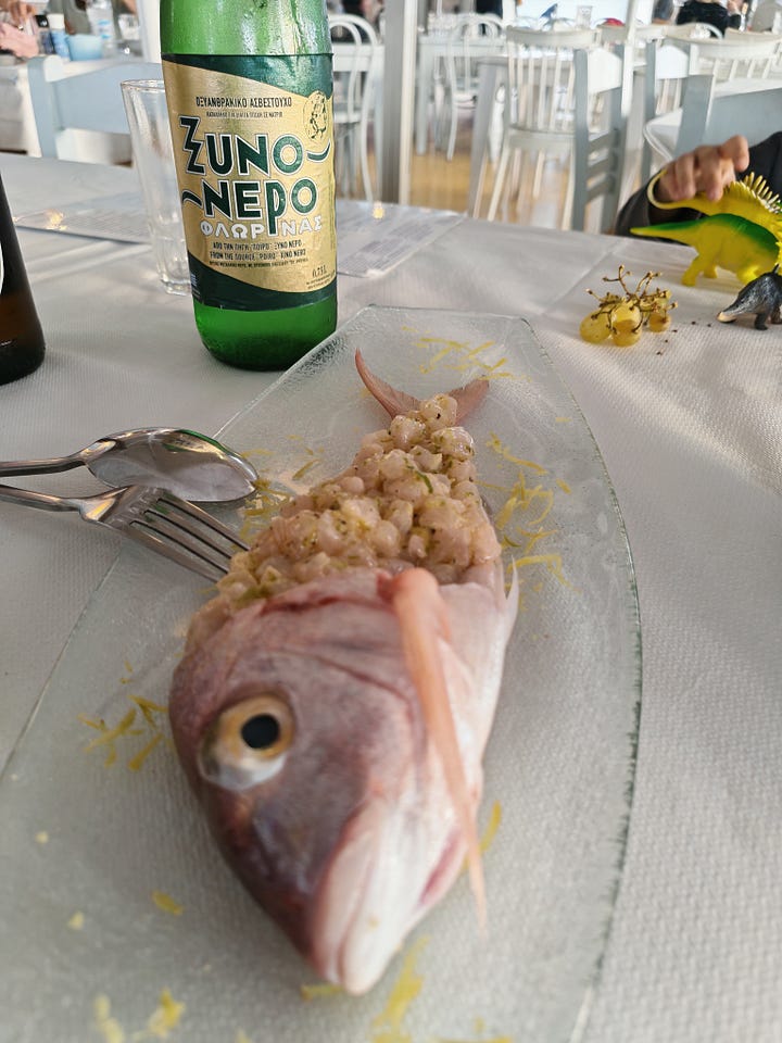 La Ouzeri o Skotadis, am ales să ieșim din zona preparatelor clasice de tavernă și să testăm selecția lor de pește crud și ceviche. A fost o schimbare binevenită față de preparatele tradiționale precum sardinele sau caracatița, iar execuția a fost curată, cu accent pe prospețime și aciditate bine calibrată.