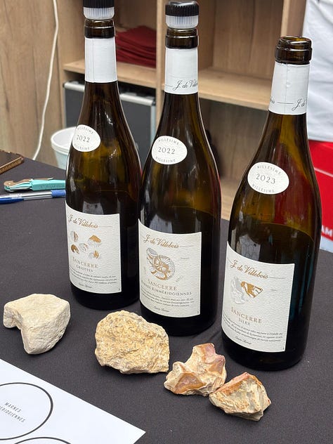 Sauvignon Blanc-ul generic, vinul de intrare în gamă, exprimă un profil floral și citric. Sancerre-ul J. de Villebois introduce deja noțiunea de “terre blanche” — soluri argilo-calcaroase care conferă structură, volum și o mineralitate mai amplă. În pahar, vinul este mai serios, mai dens, cu note de citrice coapte și piatra umedă, iar finalul devine mai lung și mai salin.